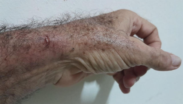 Señala Fernández Era que, aunque no recibió otra golpiza, "me apretaron tanto la esposa izquierda que me produjeron (adjunto fotos) una herida sangrante en la muñeca. A ver, defensores a ultranza de la 'legalidad socialista', ¿no es esto también tortura?"