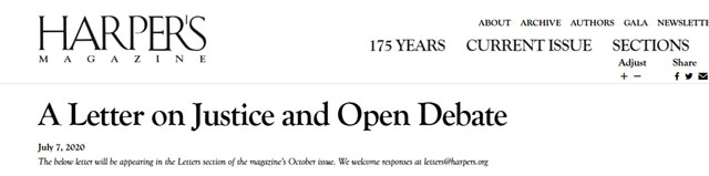 Eloy A González [ 8 de julio del 2020]- Hace unos 5 años recibí de un coterráneo establecido en New York un documento que había sido publicado en el prestigioso medio impreso aquí en los EE. UU. , Harper’s Magazine con el título de: A Letter on Justice and Open Debate. La carta también fue publicada en el diario El País de España. La nota de respuesta que escribí aparece debajo.