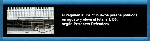 El régimen de Cuba mantiene, a día de hoy, a 1.185 presos políticos en sus cárceles. Según la ONG Prisoners Defenders, en agosto ingresaron 13 nuevas personas por motivos políticos en prisión, mientras que otras cuatro salieron de la lista: tres por cumplir íntegramente su condena y una, la activista Aymara Nieto Muñoz, por un destierro forzoso impuesto por la Seguridad del Estado.