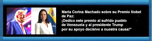 - María Corina Machado, líder opositora venezolana, dedicó el Premio Nobel de la Paz al presidente Donald Trump y al pueblo de Venezuela, destacando el apoyo de Trump a la causa democrática venezolana.