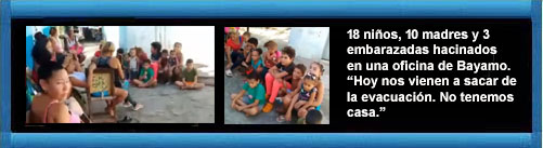 Según Carrasco, hay 18 niños, tres mujeres embarazadas, un impedido físico y diez madres sobreviviendo como pueden en la filial del Instituto Nacional de Seguridad Social de Bayamo, cocinando como pueden entre los escombros y compartiendo un baño.