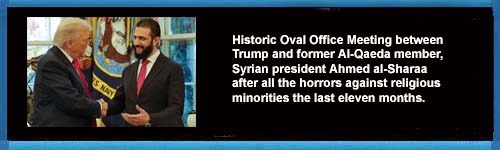 Videos: Historic Oval Office Meeting between Trump and Syrian president Ahmed al-Sharaa after all the horrors against religious minorities the last eleven months./Syrian president addresses his past connections to al-Qaeda, relations with US.