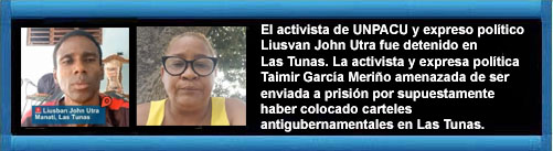 Videos Yaima Pardo: El activista de UNPACU Liusvan John Utra detenido en Las Tunas, denuncia la esposa./Taimir García Meriño amenazada de cárcel. /Video UNPACU: J. Utra acusado de falso delito. Un año del asesinato de Manuel de Jesus Guillen.