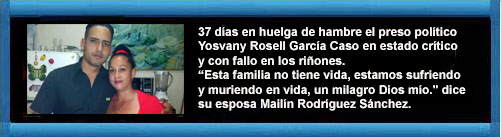 - El preso político cubano Yosvany Rosell García Caso está en estado crítico con fallo renal tras 37 días en huelga de hambre, según informó su esposa, Mailín Rodríguez Sánchez.