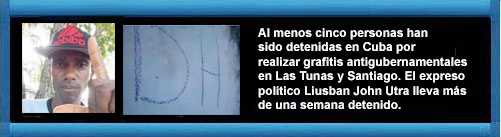 Al menos cinco personas han sido detenidas en Cuba por realizar grafitis antigubernamentales en Las Tunas y Santiago. El expreso político Liusban John Utra lleva más de una semana detenido. RTV Martí. + video UNPACU.