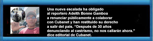 Una nueva escalada ha obligado al reportero Adelth Bonne Gamboa a renunciar públicamente a colaborar con nuestro medio. En los dos últimos años, el joven ha sido acosado por la policía política. Su madre fue amenazada con perder su empleo y con consecuencias nefastas para la integridad física de su hijo, lo cual le provocó una crisis de hipertensión que requirió atención médica. Sus amigos y allegados también fueron llamados e intimidados para que dejaran de frecuentarlo y mostrarle su apoyo, todo con el objetivo de aislarlo y hacerlo más vulnerable a los efectos de la persecución política prolongada.
