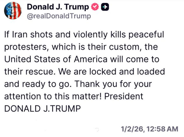 "Estamos listos, armados y preparados para actuar", la advertencia de Trump a Iran."Si Irán dispara y mata violentamente a manifestantes pacíficos... EEUU acudirá en su rescate". RTV Martí./EEUU sanciona a Venezuela e Irán por comercio de drones.
