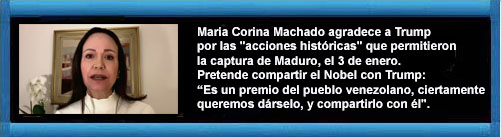 Para la opositora venezolana, las operaciones militares llevadas a cabo por fuerzas estadounidenses el 3 de enero para extraer al dictador venezolano, Nicolás Maduro, y a su esposa, Cilia Flores, hicieron aún más digno del reconocimiento al inquilino de la Casa Blanca, quien había sido nominado al igual que ella.