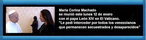 La líder democrática y ganadora del Premio Nobel de Paz se reunió este lunes 12 de enero con el papa León XIV en El Vaticano. Machado afirmó, mediante una nota de prensa, que le dijo al papa que con el acompañamiento de la Iglesia y la presión sin precedentes del Gobierno de los Estados Unidos, "está más cerca la derrota del mal" en Venezuela. "Le pedí interceder por todos los venezolanos que permanecen secuestrados y desaparecidos", añadió la Premio Nobel de la Paz.