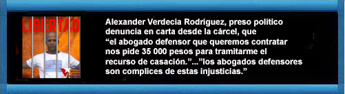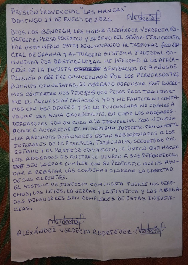 Alexander Verdecia Rodríguez, preso político, denuncia en carta desde la prisión que los abogados defensores son cómplices de las injusticias, lo único que hacen los abogados es quitarle dinero exorbitante a sus defendidos.