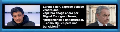 Saleh ha cuestionado duramente el rol actual del expresidente: “¿Qué está haciendo ahorita?”. Le acusa de abogar ahora por Miguel Rodríguez Torres, exministro de Interior y fundador de ‘La Tumba’. “¿Por qué él hoy está proponiendo a un torturador, a alguien investigado por crímenes graves, como alguien para una transición?”, se ha preguntado. Además, ha revelado que el Gobierno de Pedro Sánchez le confirmó en una reunión en Moncloa que Zapatero “no tenía nada que ver” en su liberación, que fue una gestión del ejecutivo español.