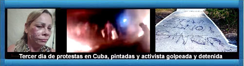 Tercer día de protestas en Cuba: cacerolazos, calles bloqueadas y nuevas pintadas contra el régimen. La opositora Marianela Peña Cobas fue detenida y golpeada. Diario de Cuba. + enlaces a videos.