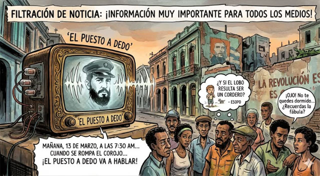 Ah, pero dicen que mañana se rompe el corojo, que ya ni corojo hay. Las autoridades cubanas han filtrado la noticia a “malanga y el puesto de viandas” , esta es que: habrá una información muy importante que se dará a la población y a todos los medios de comunicación, por todos los medios en la ínsula desgraciada. Esto será mañana, el 13 de marzo, a las 7:30 am cuando se rompa el corojo. No se queden dormidos que va a hablar Fidel…, digo ese ya no habla, será el puesto a dedo.