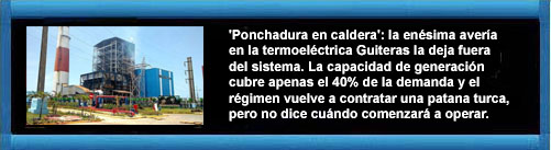 'Ponchadura en caldera': la enésima avería en la termoeléctrica Guiteras la deja fuera del sistema.La capacidad de generación cubre apenas el 40% de la demanda y el régimen vuelve a contratar una patana turca. Diario de Cuba.
